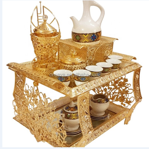 2022 Nieuwe Collectie Habesha Ethiopische Golden Metal Rekebot Tafel Koffie Lade Set Met Porselein Thee Kopjes En Schoteltjes